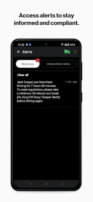 • Warning and alerts for approaching violations or break completions.